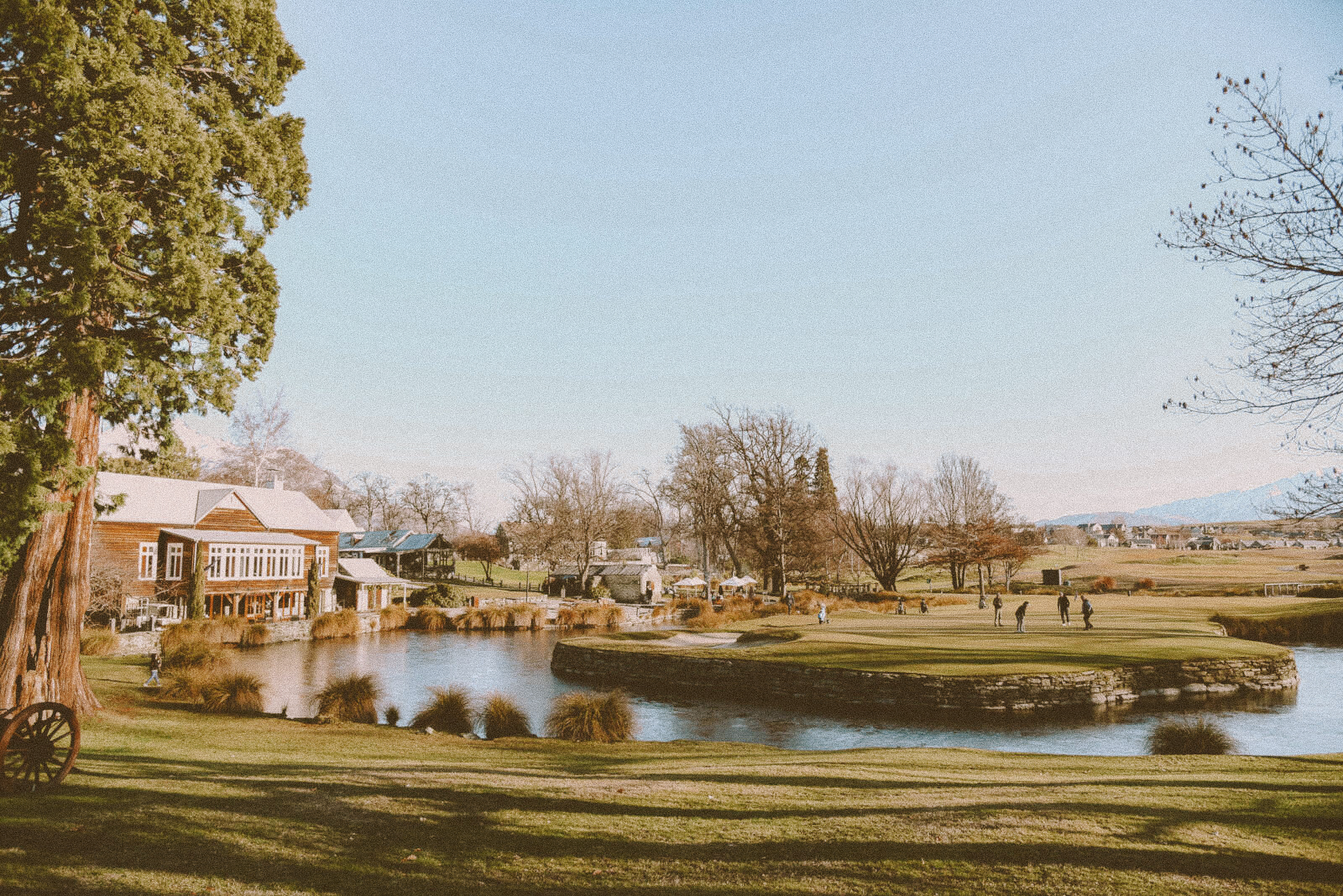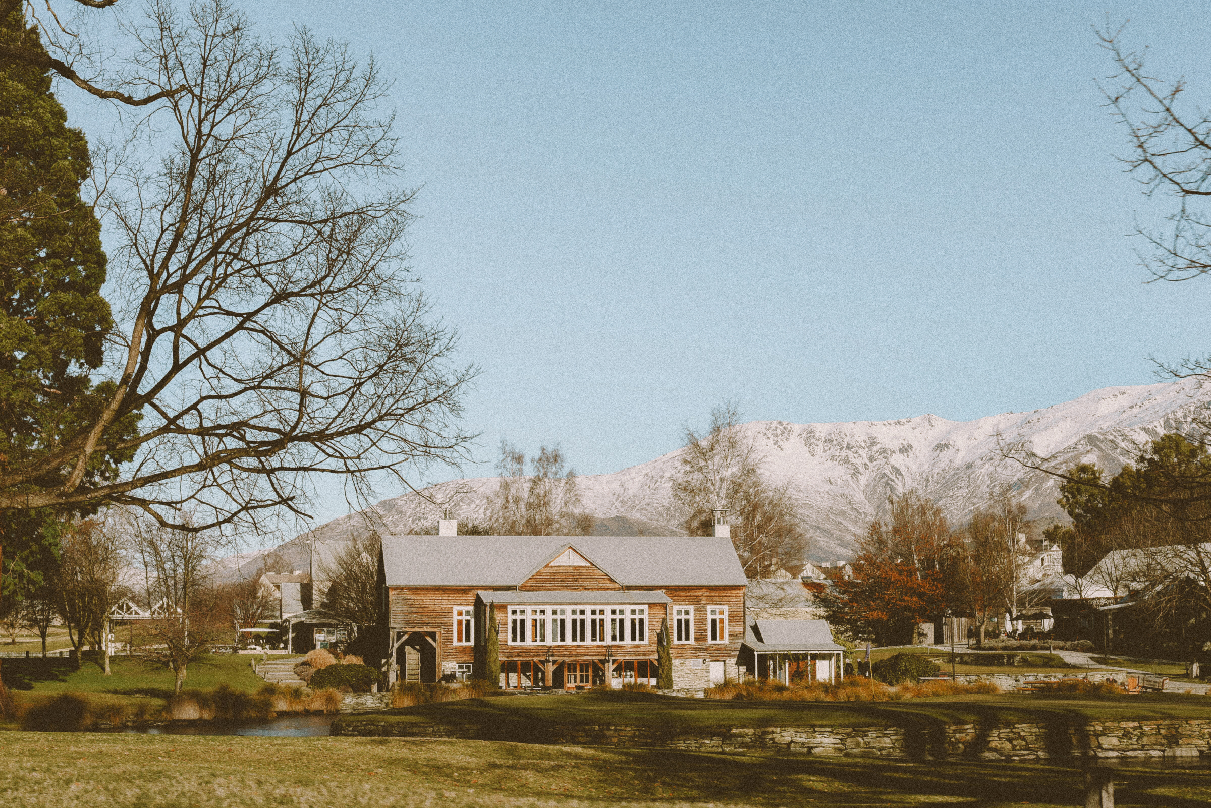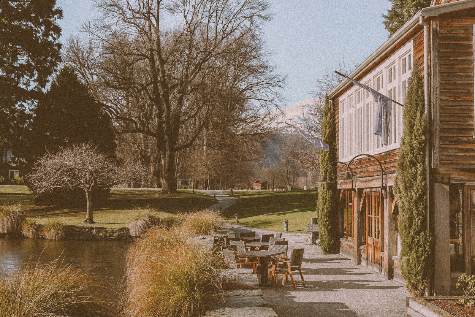 The design of the Millhouse Restaurant combines historical elements with modern touches, creating a unique dining atmosphere. The interior features cosy fireplaces, vintage furnishings, and large windows facing towards Coronet Peak. Outside, DEVON furniture sits on the terrace beside the pond, providing an idyllic setting for al fresco dining throughout the year. This allows guests to savour the serene alpine surroundings in comfort and style.